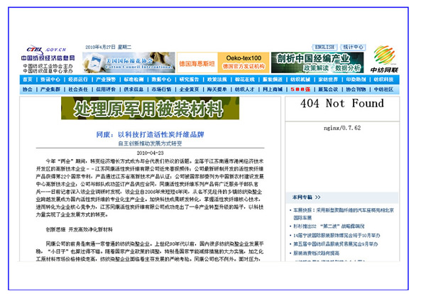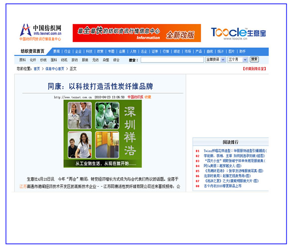 中國(guó)紡織經(jīng)濟(jì)信息網(wǎng)、中國(guó)紡織網(wǎng)——同康:以科技打造活性碳纖維品牌